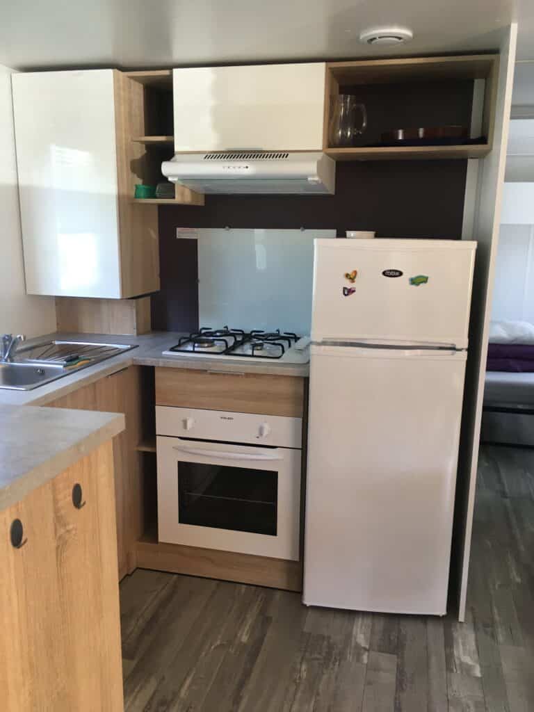 Cuisine avec gazinière 4 feux, micro-ondes, frigo, hotte de cuisine 2023